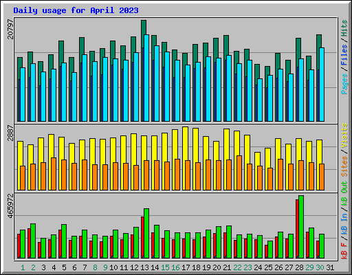 | Day | Hits | Files | Pages | Visits | Sites | kB F | kB In | kB Out | ||||||||