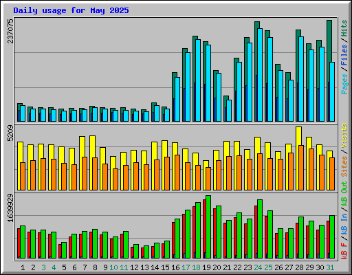 | Day | Hits | Files | Pages | Visits | Sites | kB F | kB In | kB Out | ||||||||