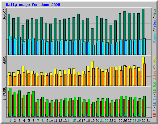 | Day | Hits | Files | Pages | Visits | Sites | kB F | kB In | kB Out | ||||||||